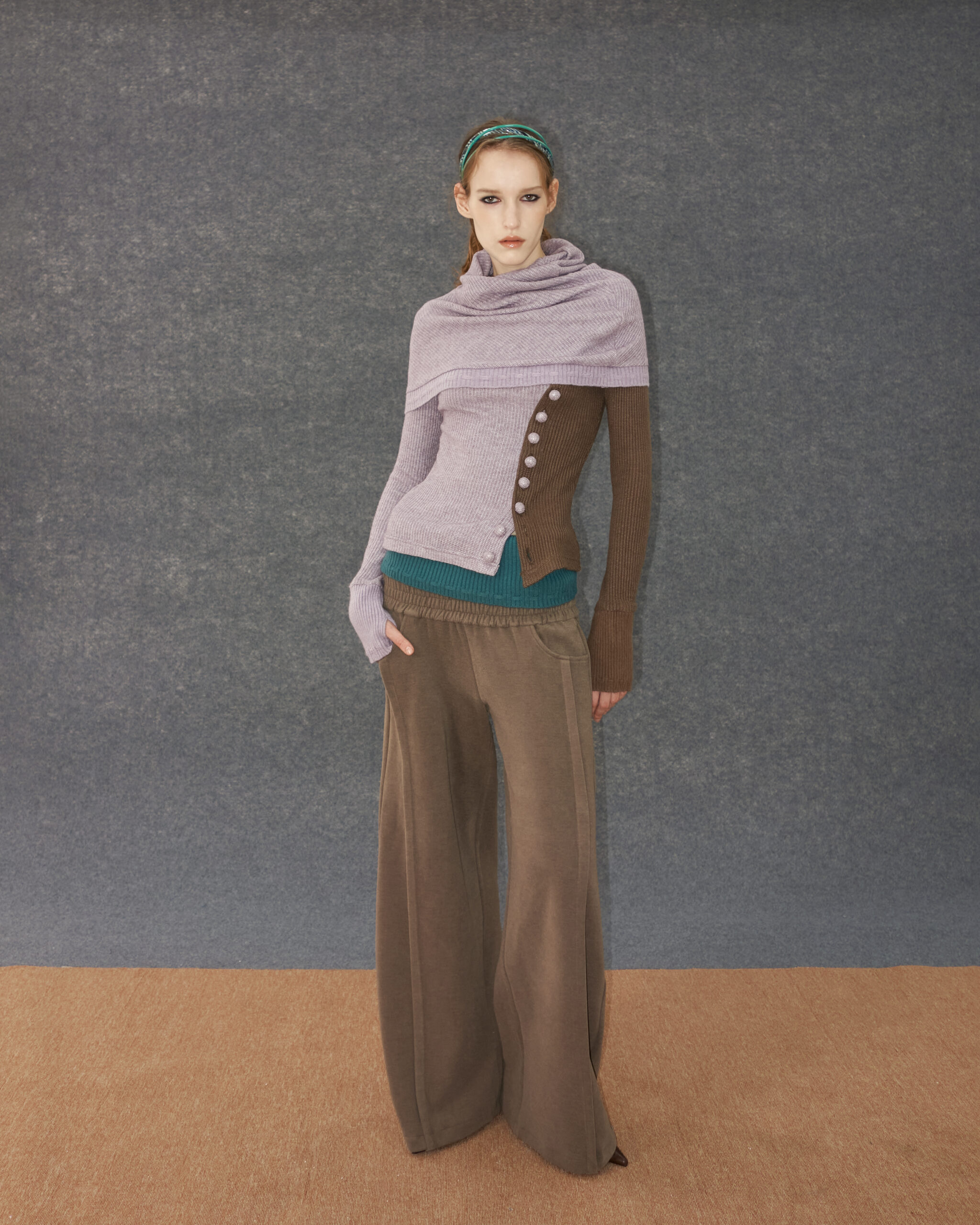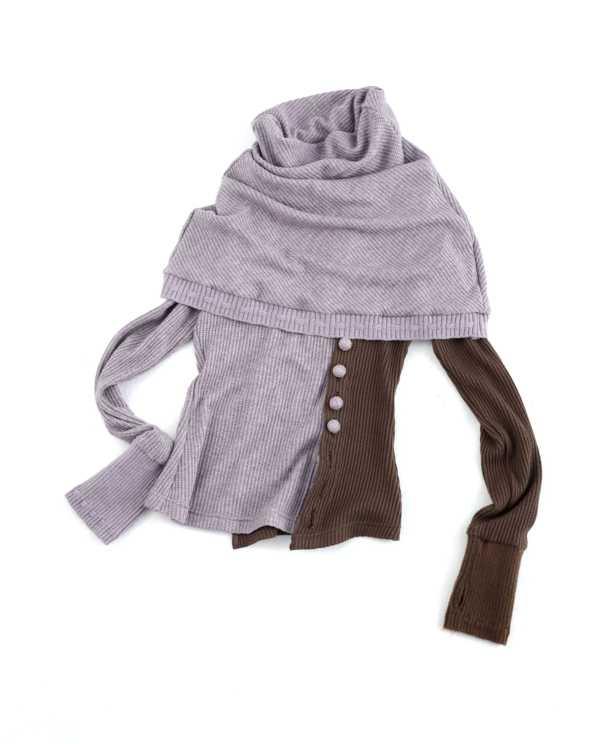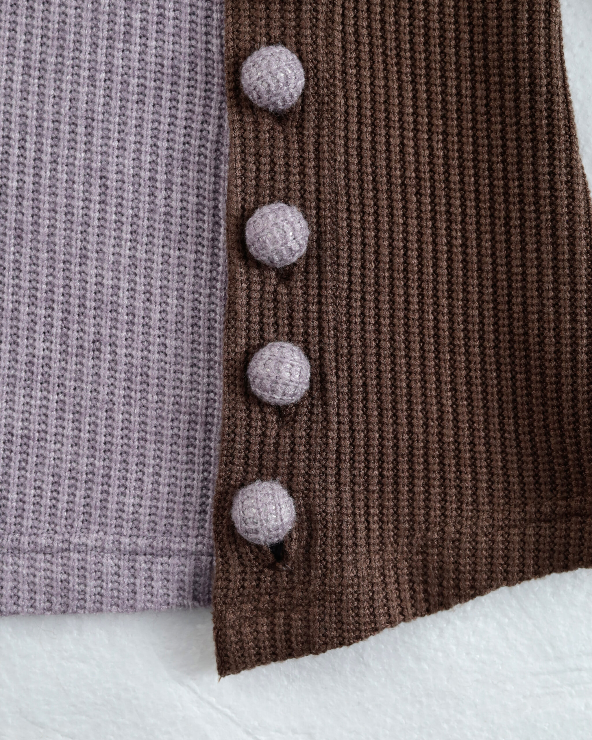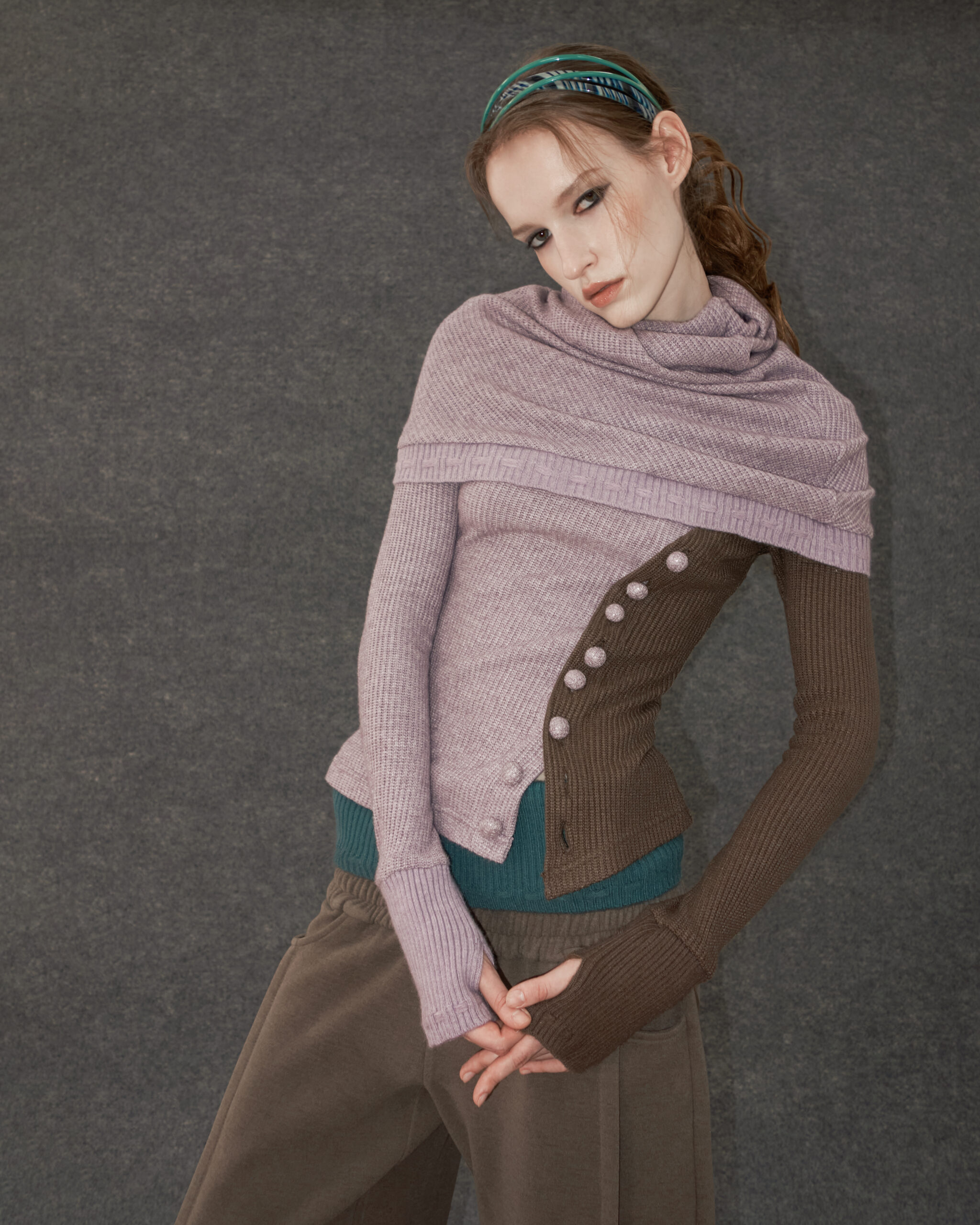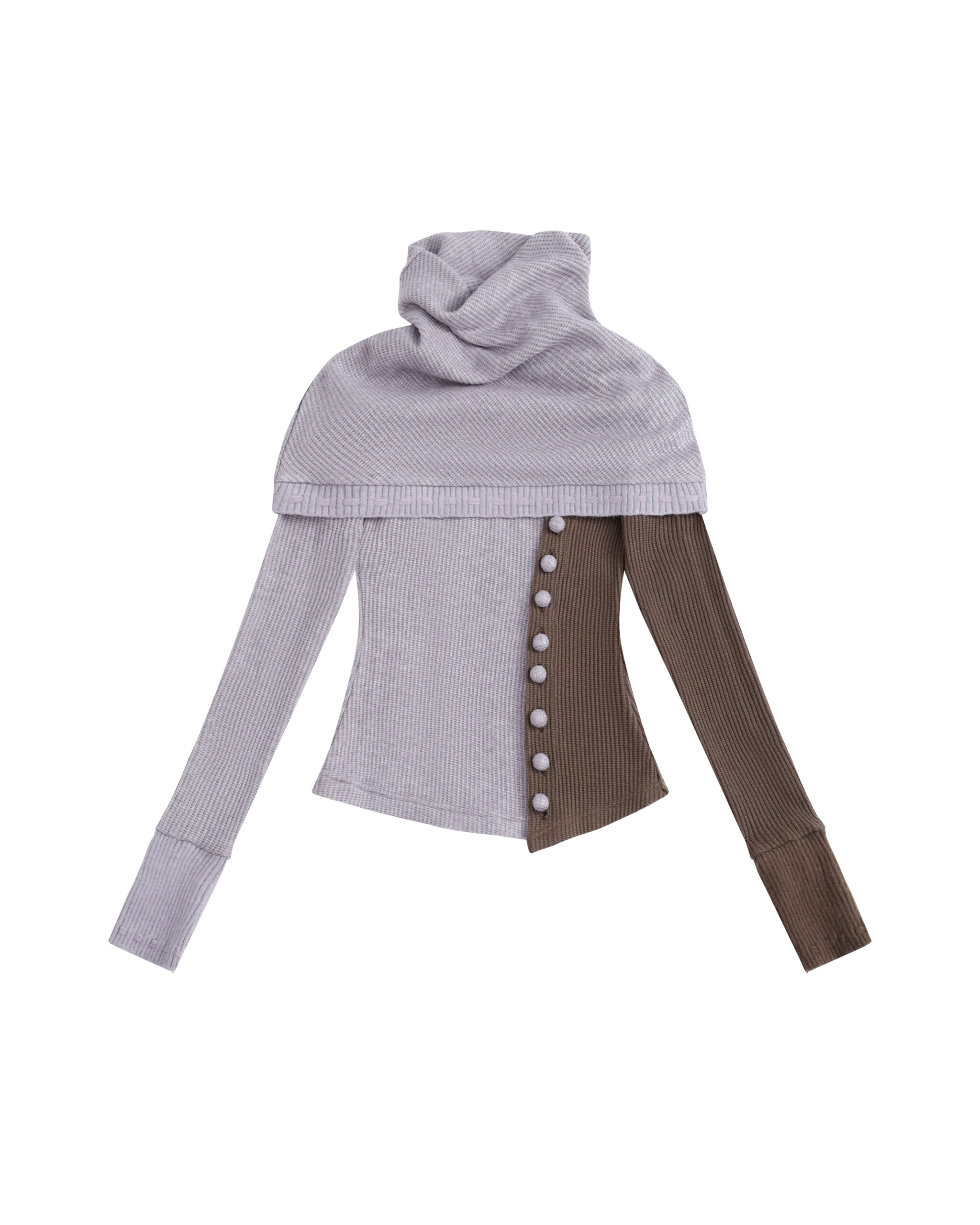 The Ceris Cape Top is a light winter knit designed with functional and decorative details. It features wrapped buttons at the front and a custom lacing pattern at the hems. The asymmetrical colors and hemlines introduce a dynamic element to the design. Available in two colorways, this piece offers a versatile option for winter layering.
