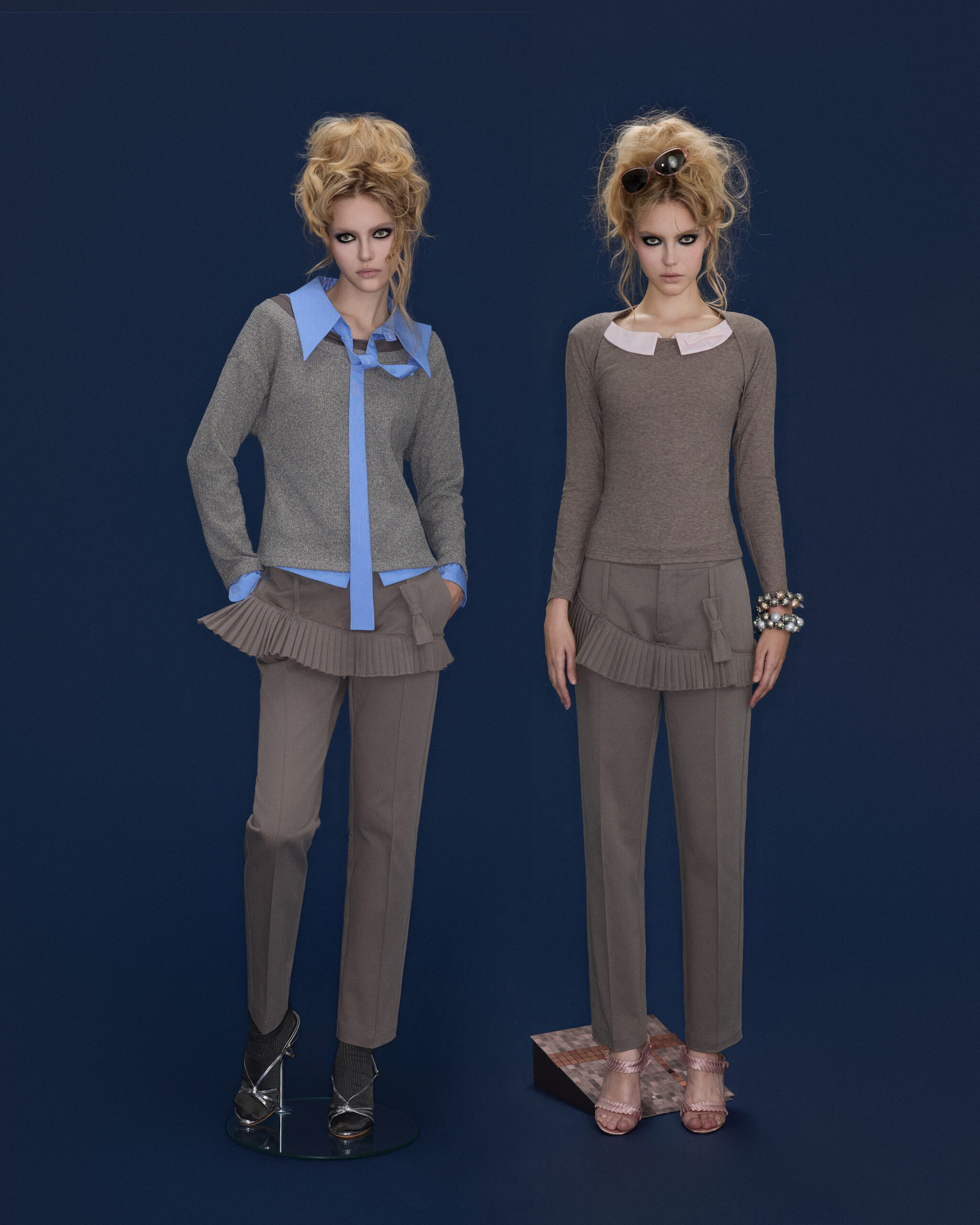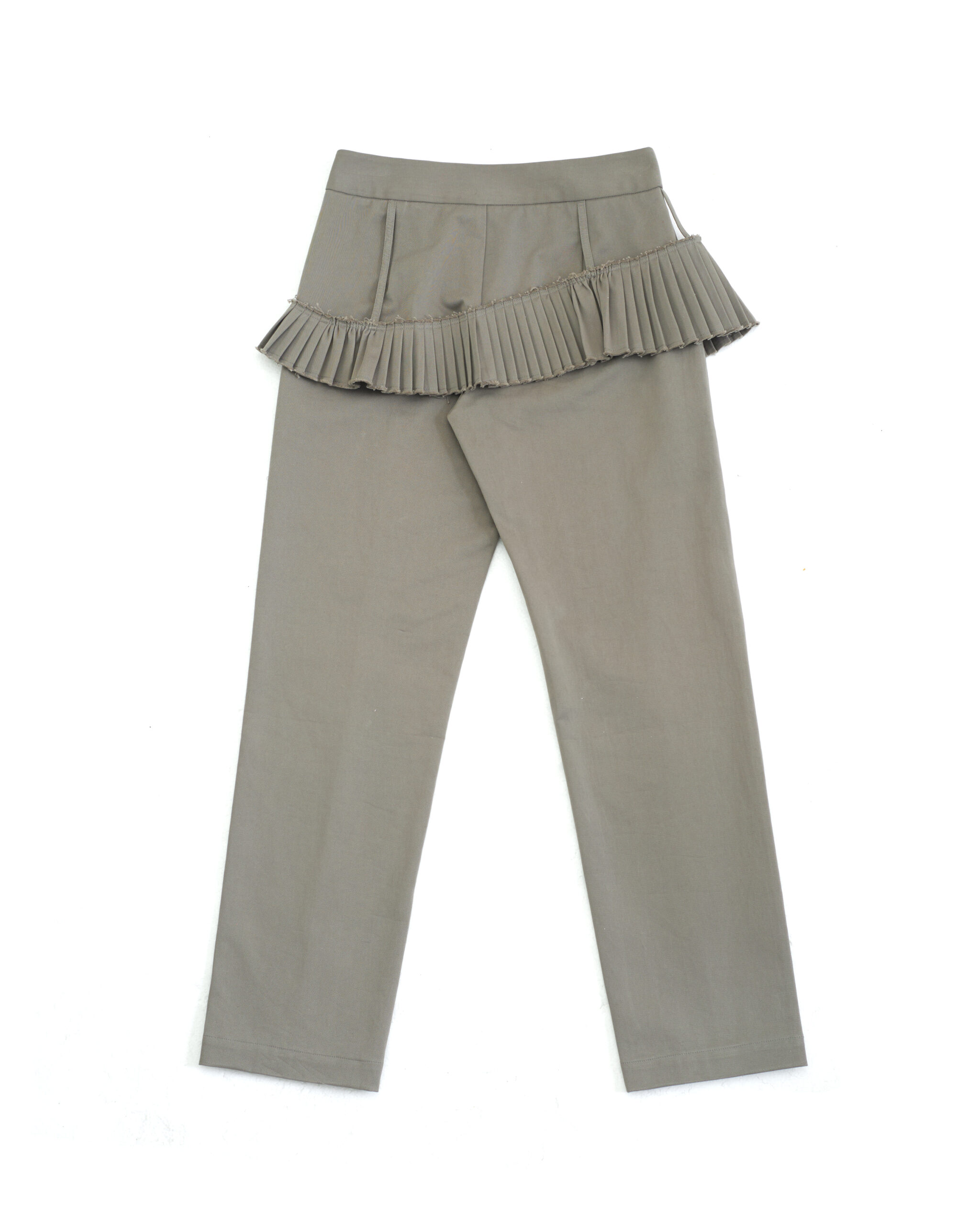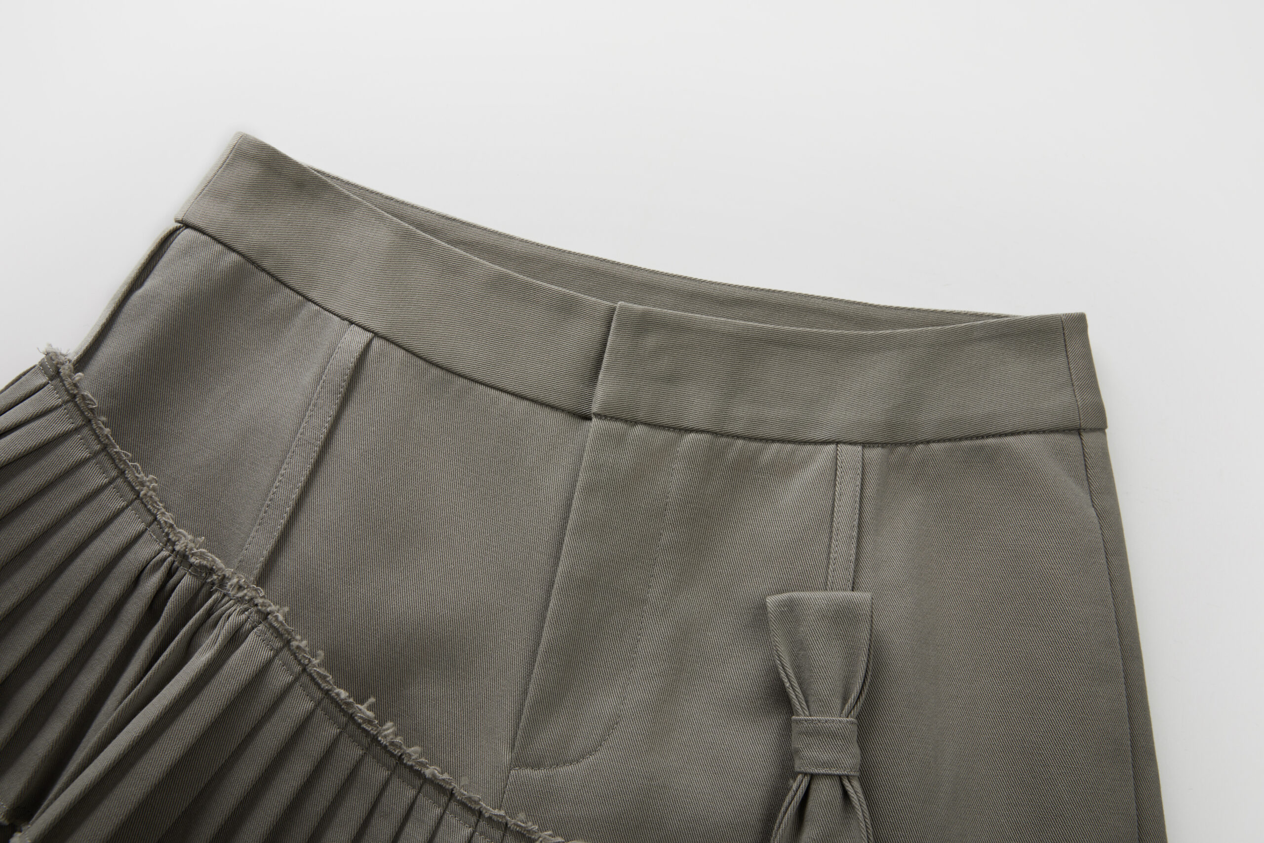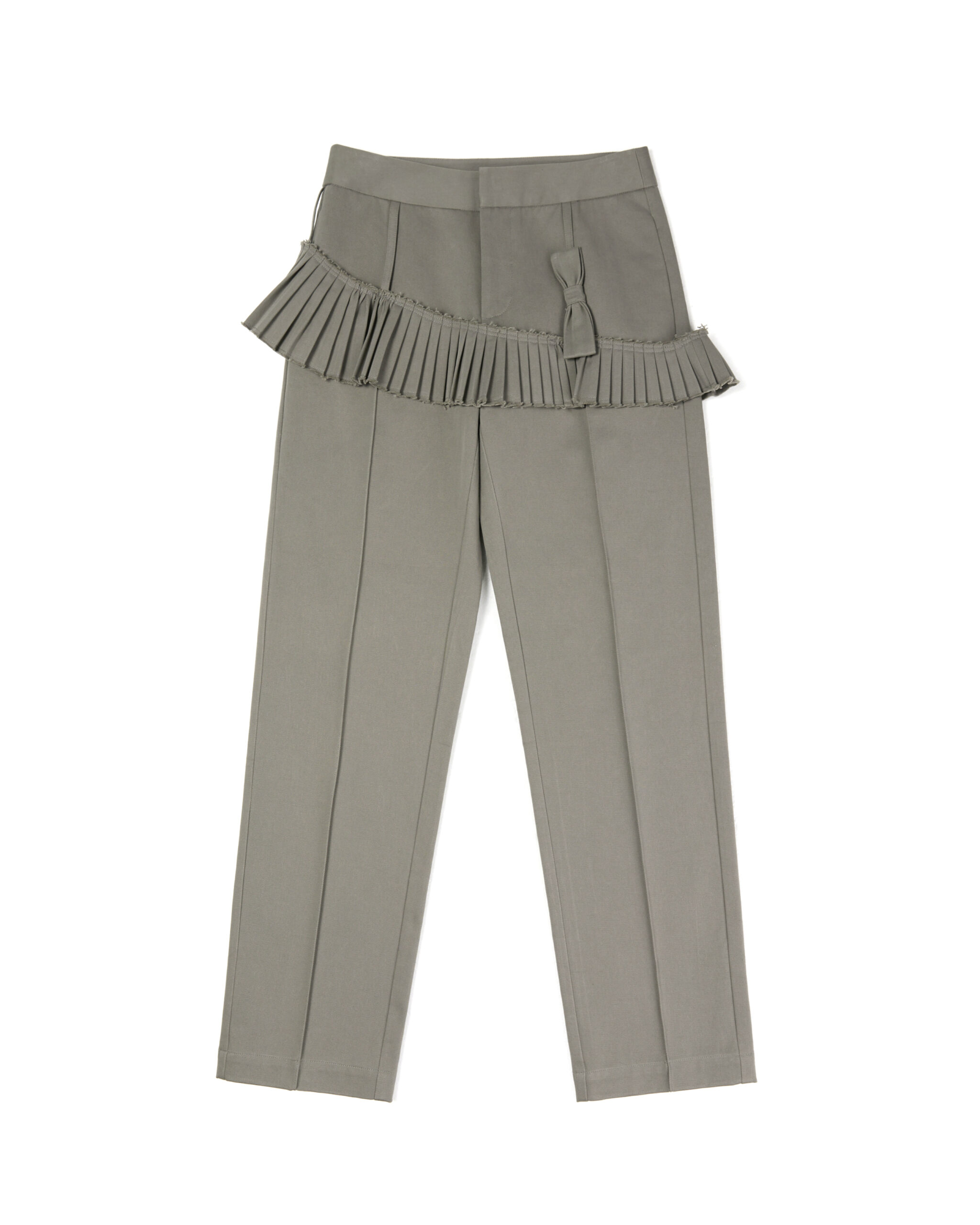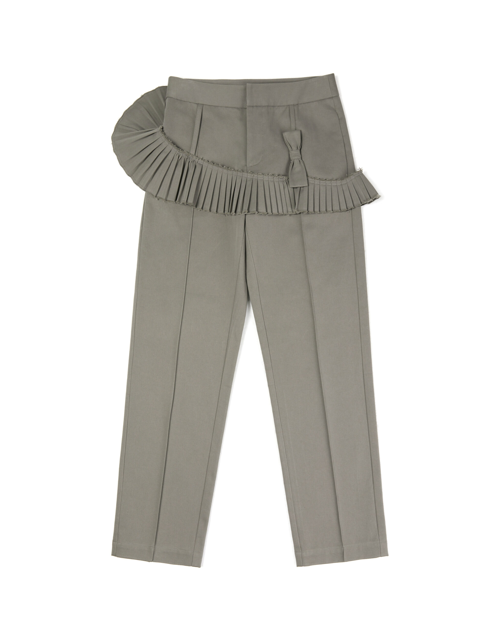 Discover the Cade Skirt Pants (Light Grey), based on a slim straight-leg tailored trouser silhouette, layered with an asymmetric suspender-style pleated bow skirt panel. The design introduces feminine softness into a structured, restrained form.