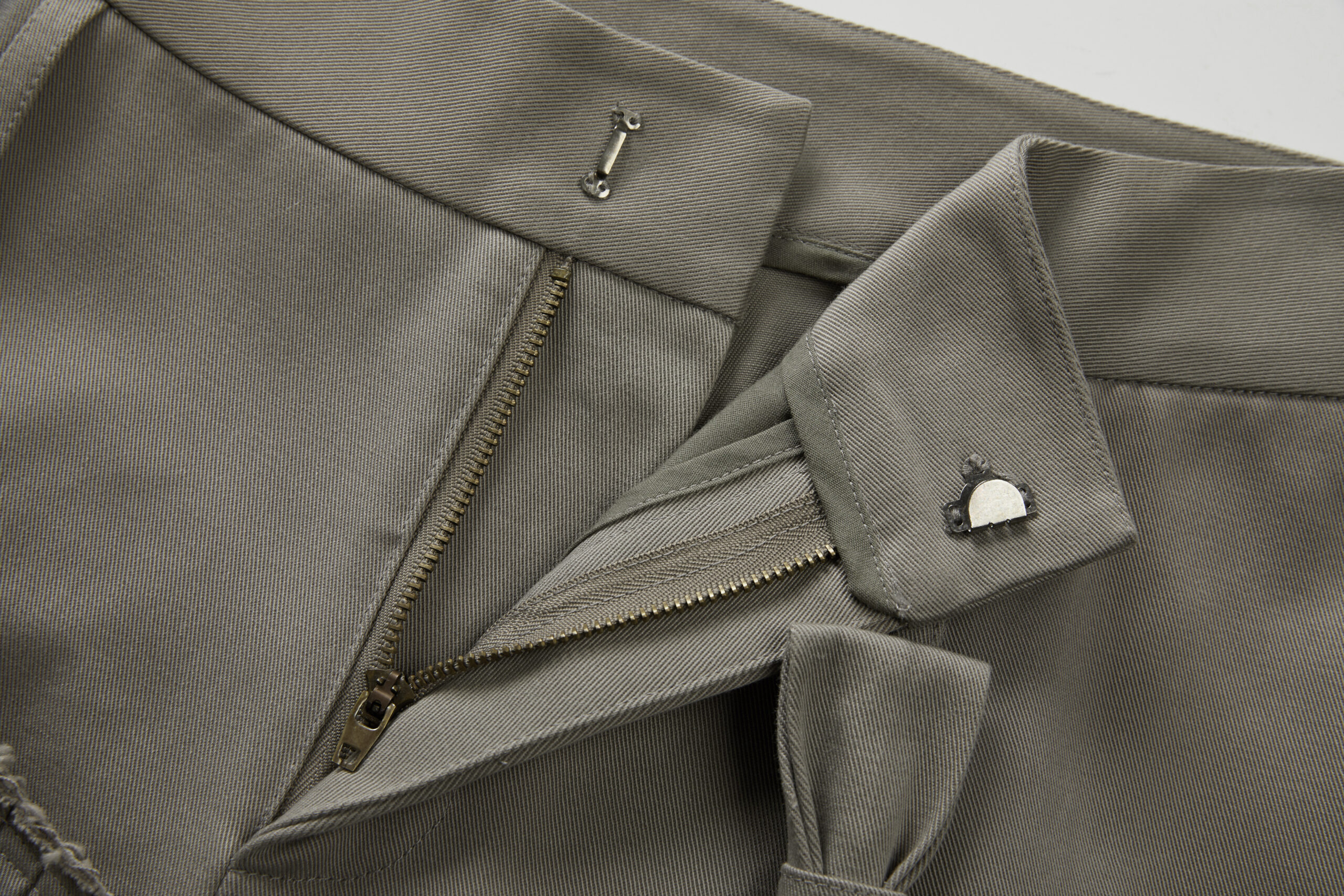 The waistband is finished with clean bound-edge detailing and a concealed hook closure, maintaining a sharp, streamlined line.