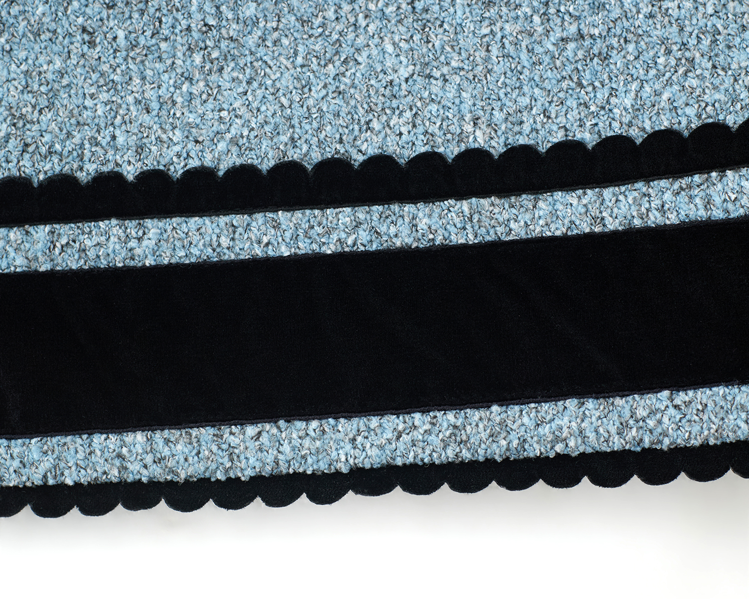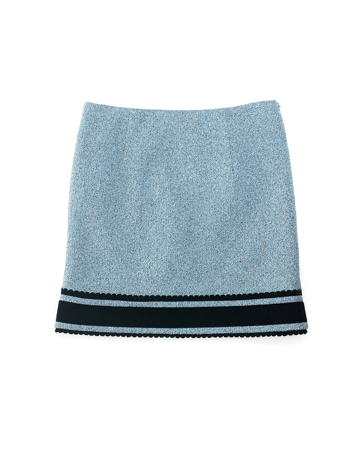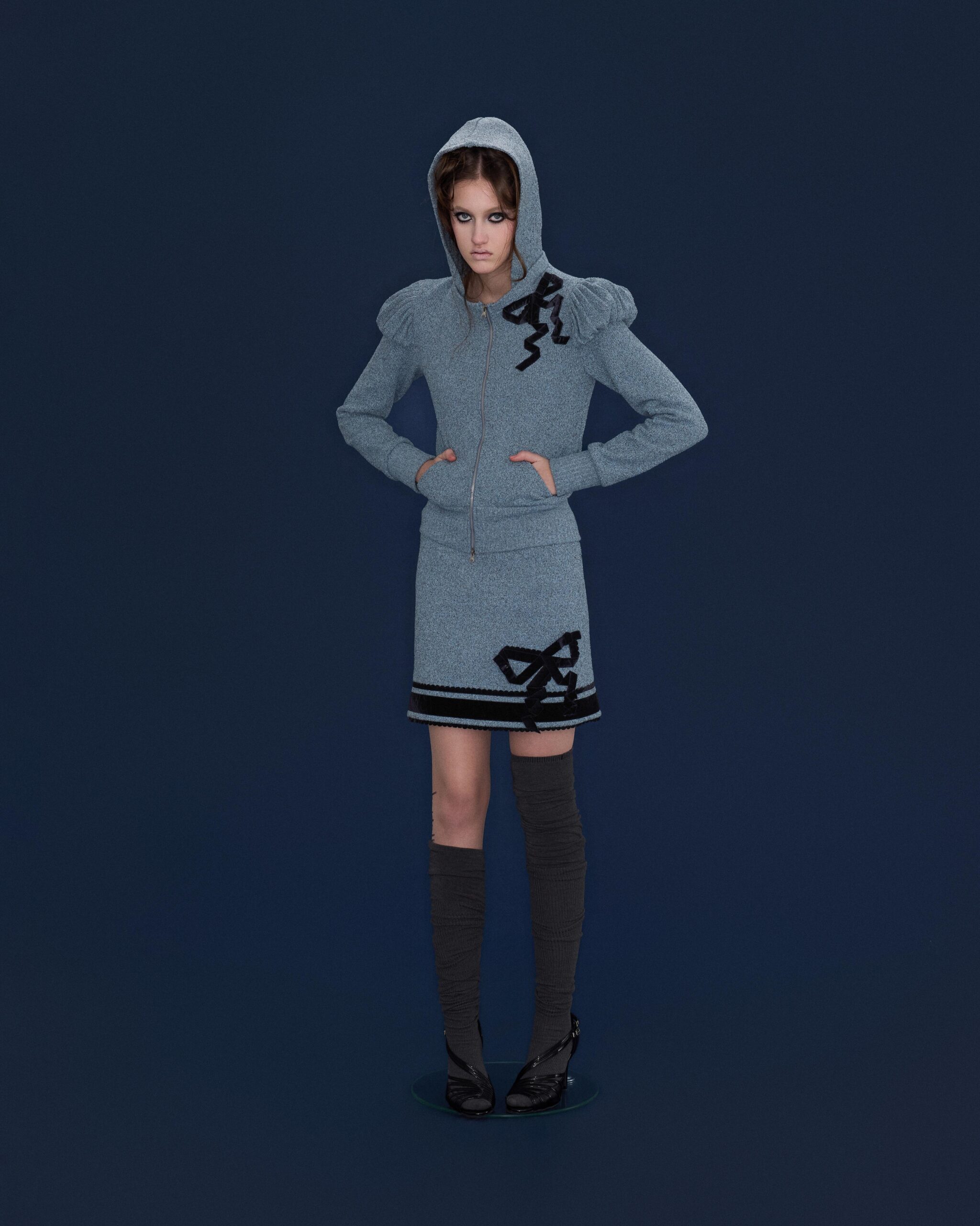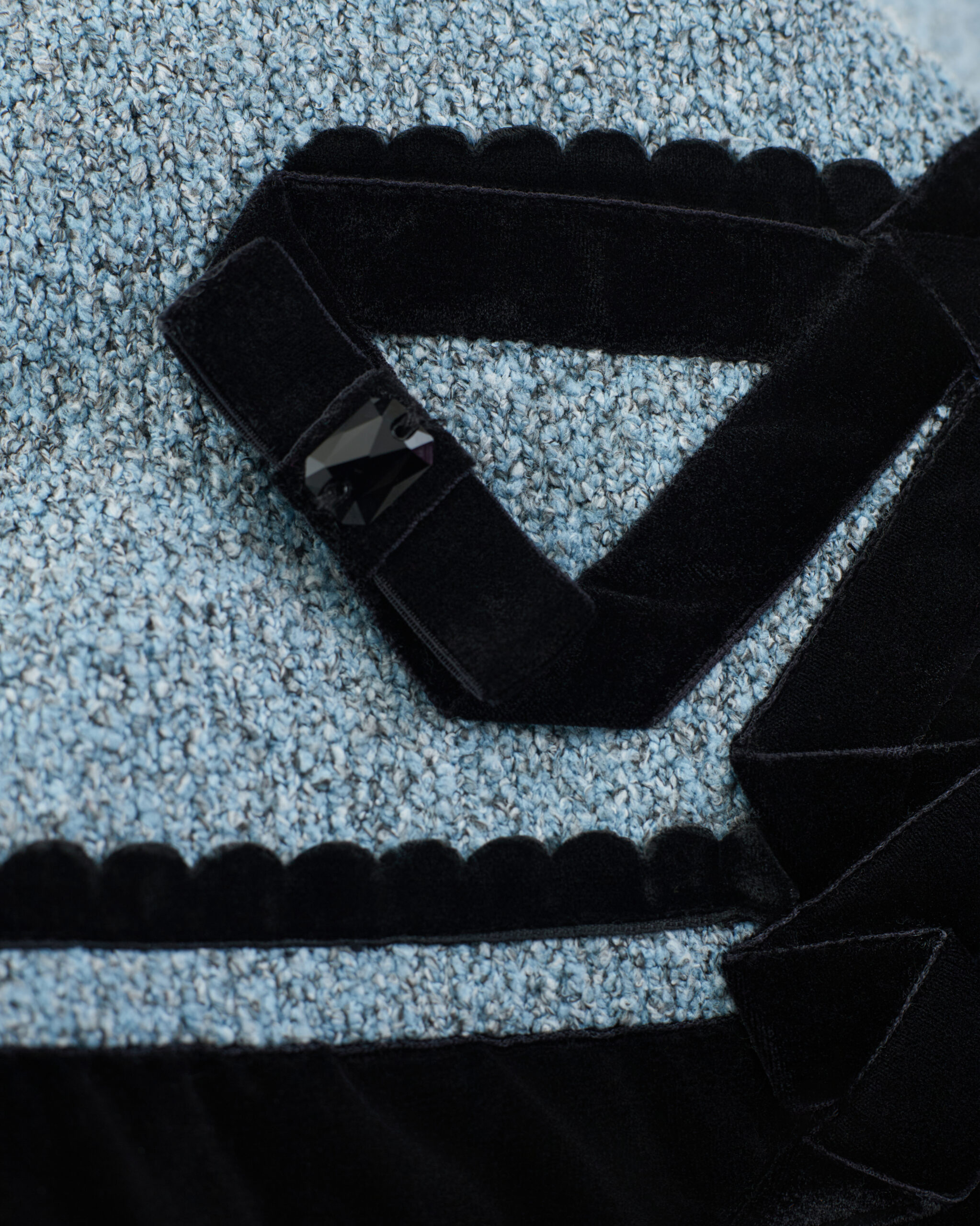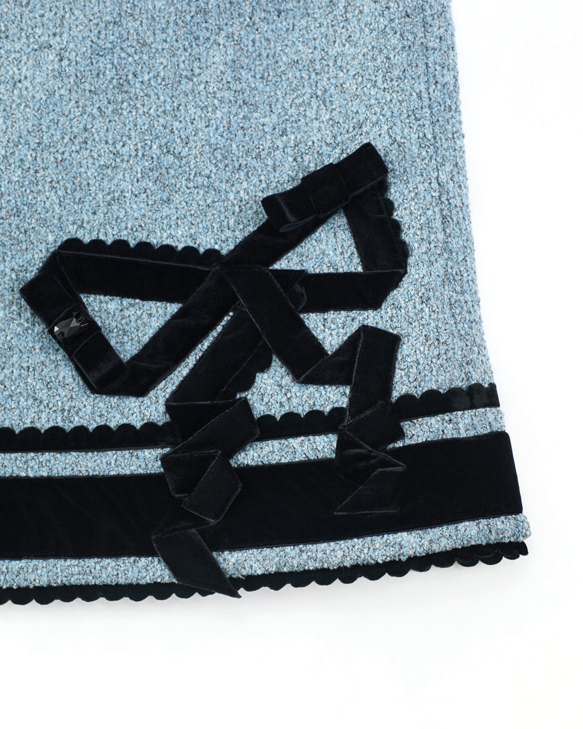 Discover the Etta Velvet Skirt (Black + Blue), inspired by the ornamental language of classical ceremonial dress. Flat bow motifs constructed from woven tape reinterpret elements of ritual and formality through a contemporary lens. The skirt pairs black velvet with blue textured knit, creating a subtle material contrast within a deep, tonal palette. Three-dimensional crystal embellishments and two small sculptural bows layered over the flat bow structure Laser-cut semicircular trims further enhance the vintage sensibility, balanced by a clean, modern silhouette. A slim straight cut combined with a gently curved hem elongates the proportions. This listing is for the midi-length skirt. A mini skirt version from the same series is also available.
