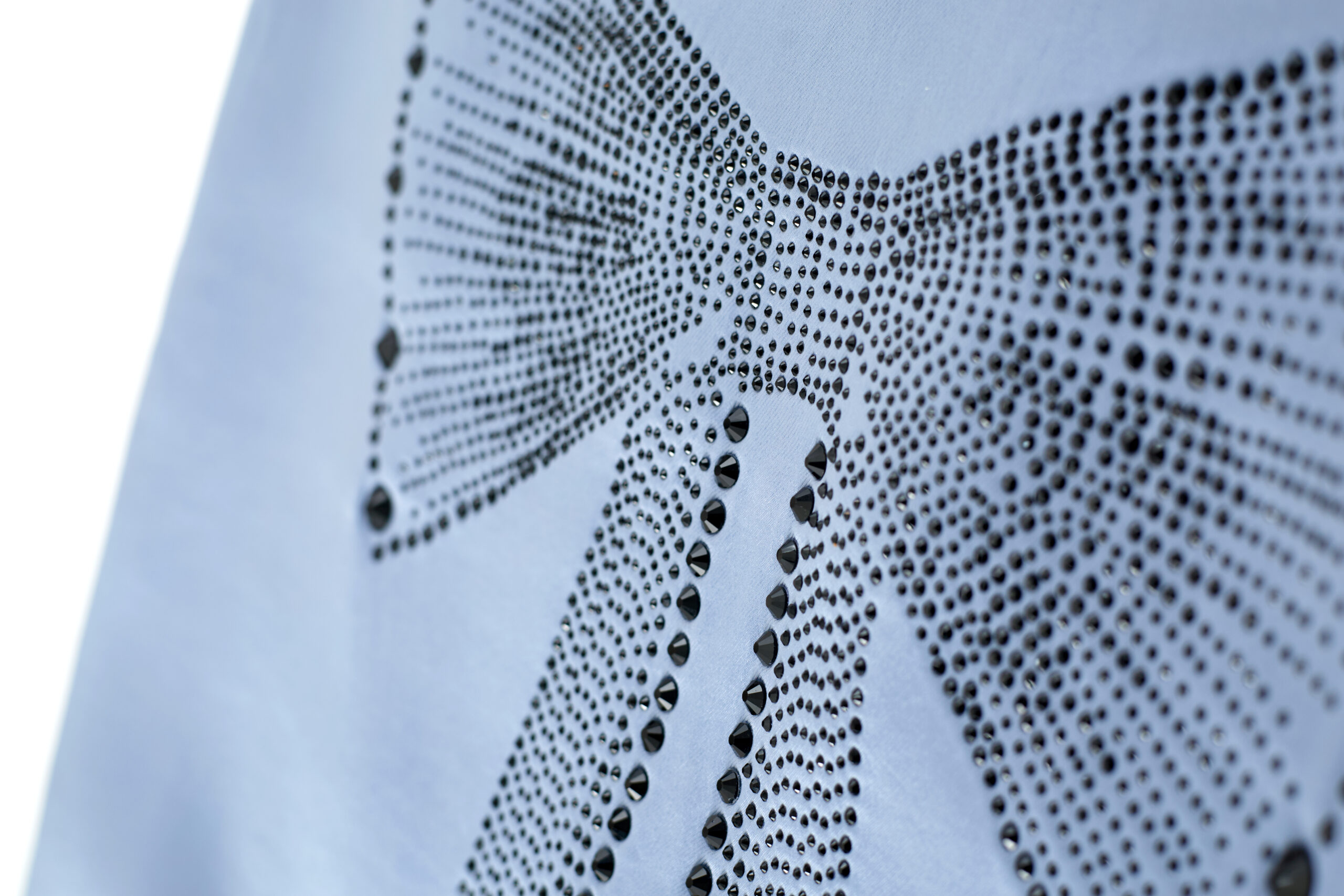 An oversized bow motif is constructed from high-grade black three-dimensional rhinestones in varying sizes. The design extends into a waist-chain–like structure that wraps continuously around the waist and hip area, creating a 360° visual effect. An irregular hemline adds the impression of an additional layered ornament.