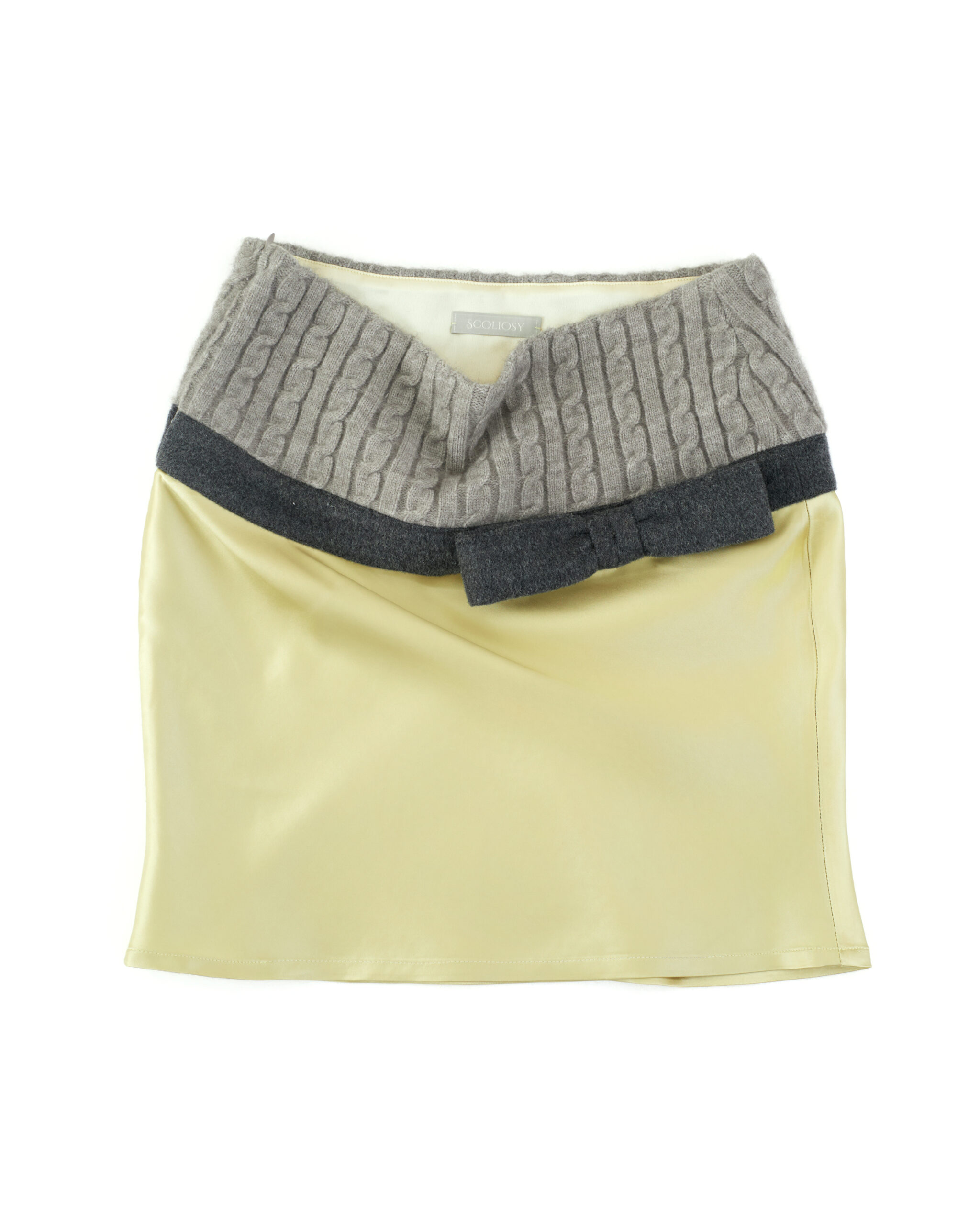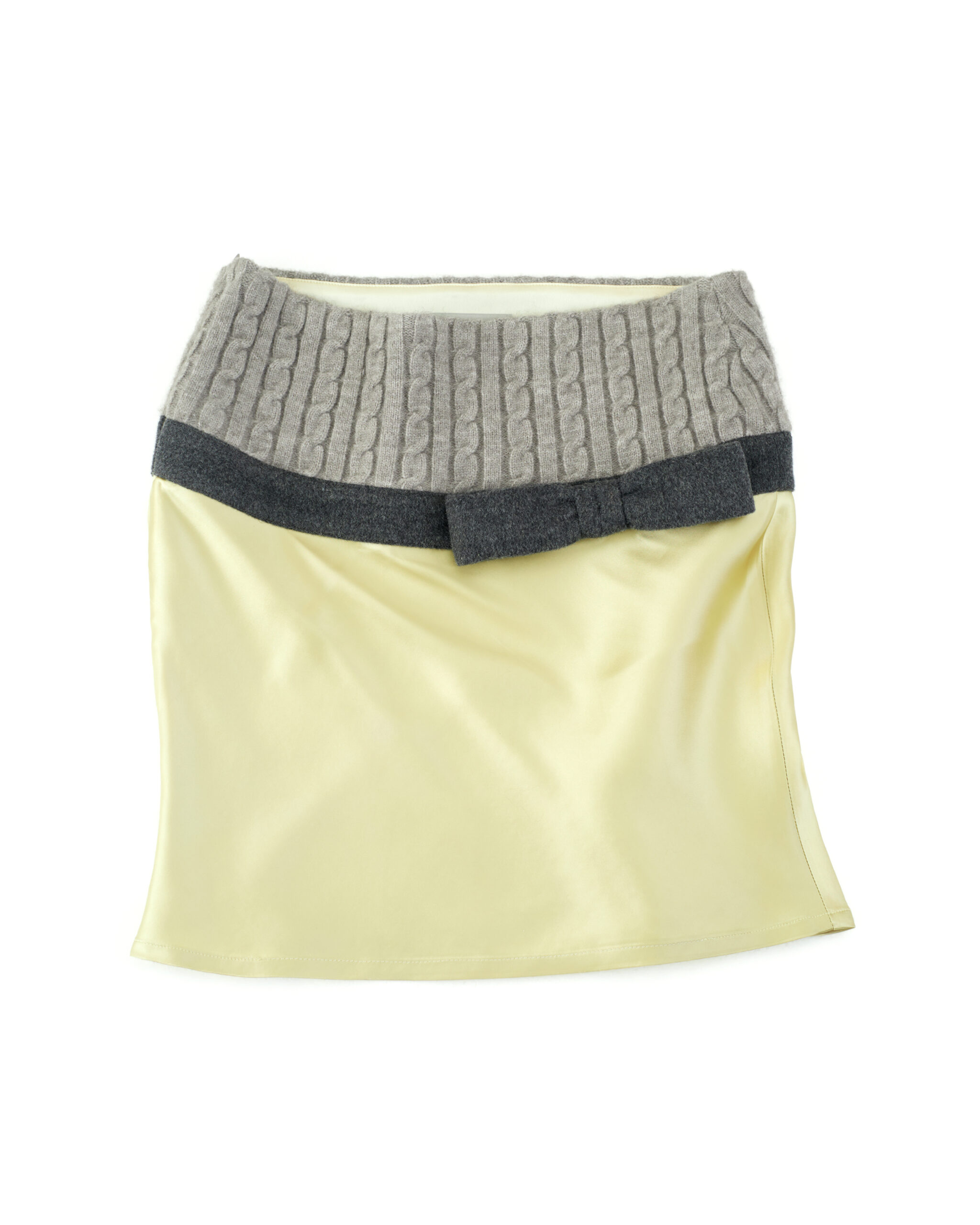 The design is accented with a matte, knot-textured ribbed waistband, paired with a padded wool sculptural bow, introducing a subtle contrast to its otherwise restrained vintage character.